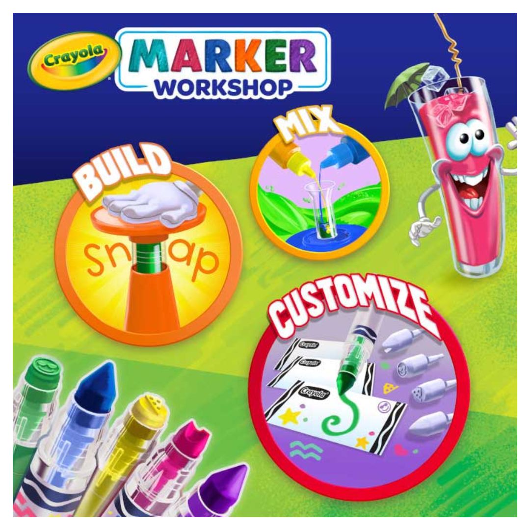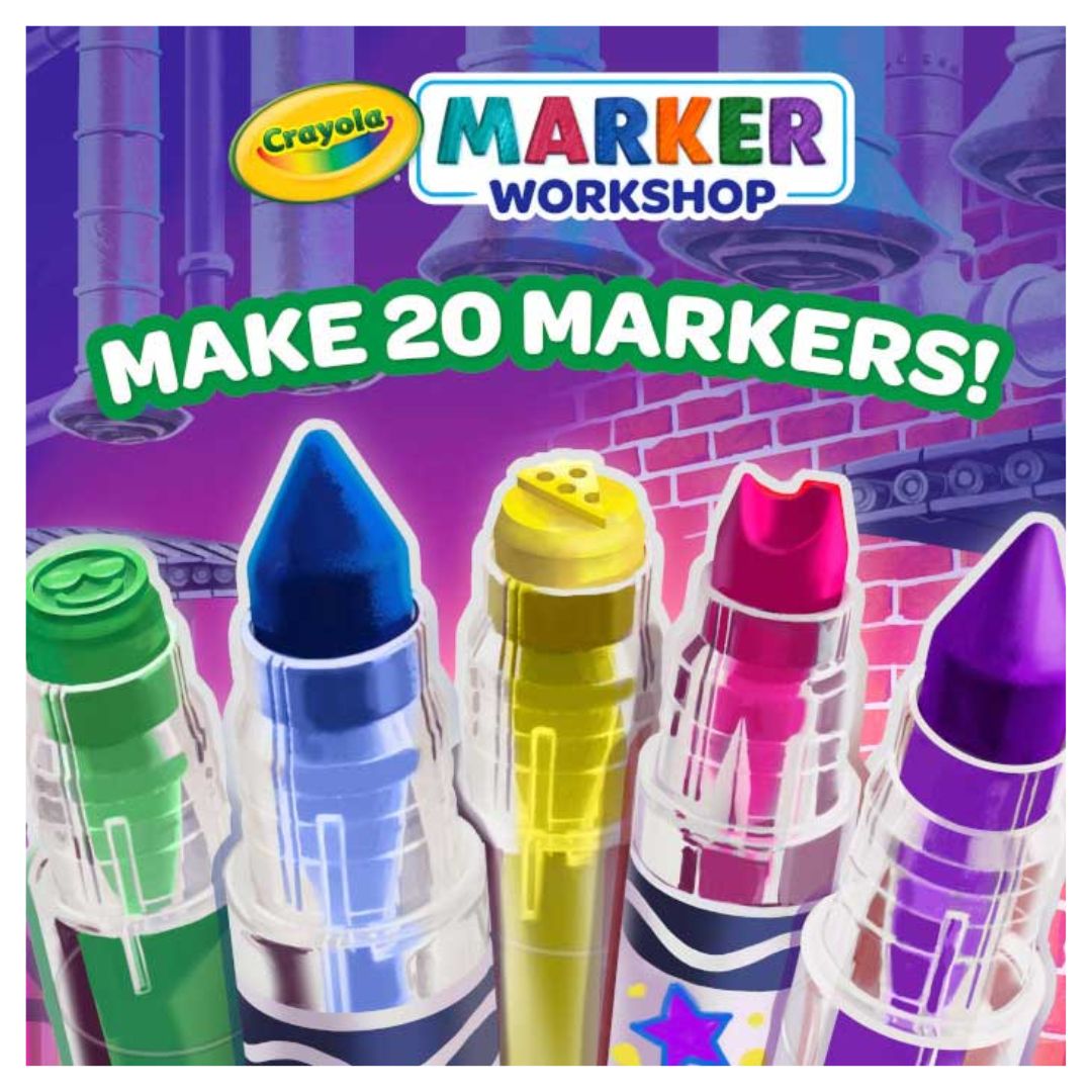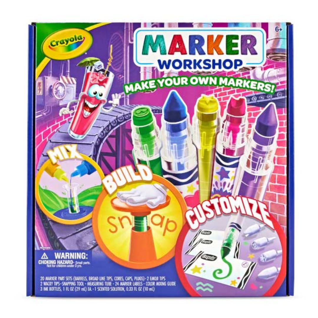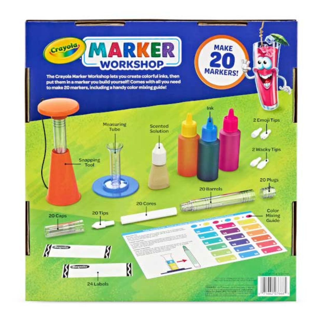 BUILD YOUR OWN MARKERS: Assemble 20 custom Crayola markers using the included Marker Maker, measuring vial, 3 bold ink colors, 1 fruit punch-scented ink, 24 labels, and 4 fun nibs (emoji + wacky styles).
