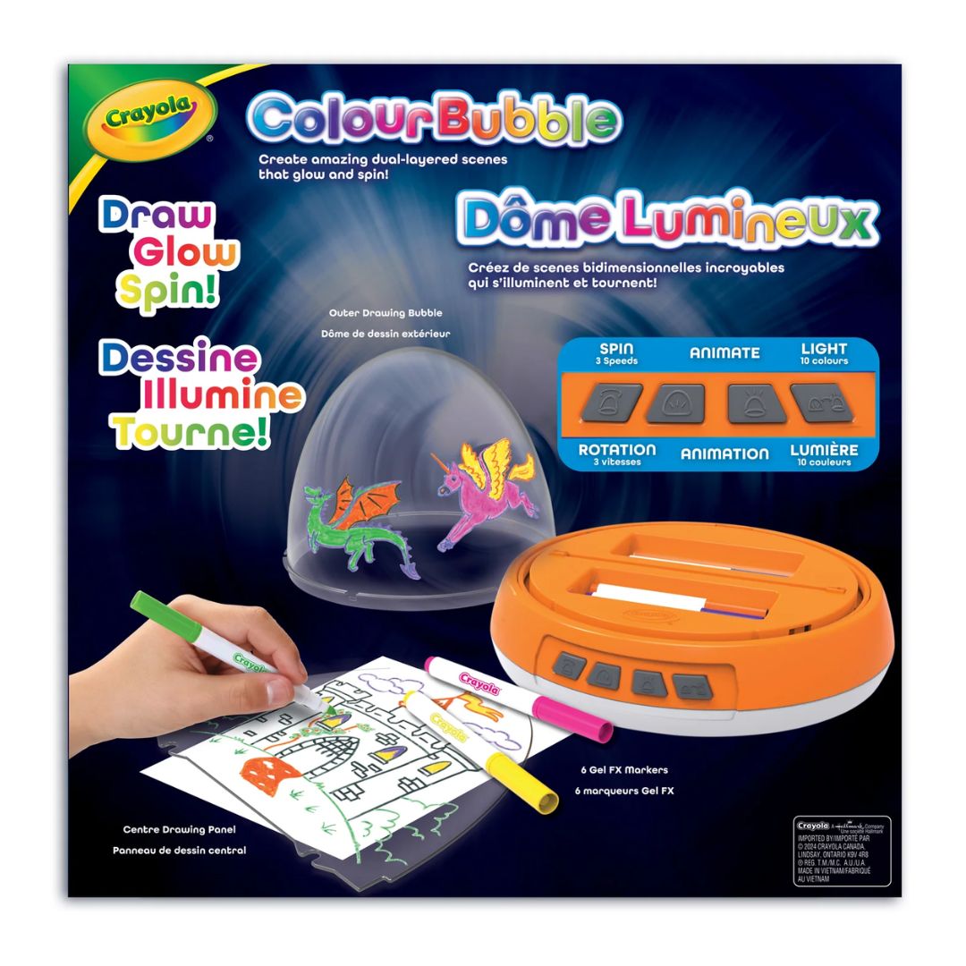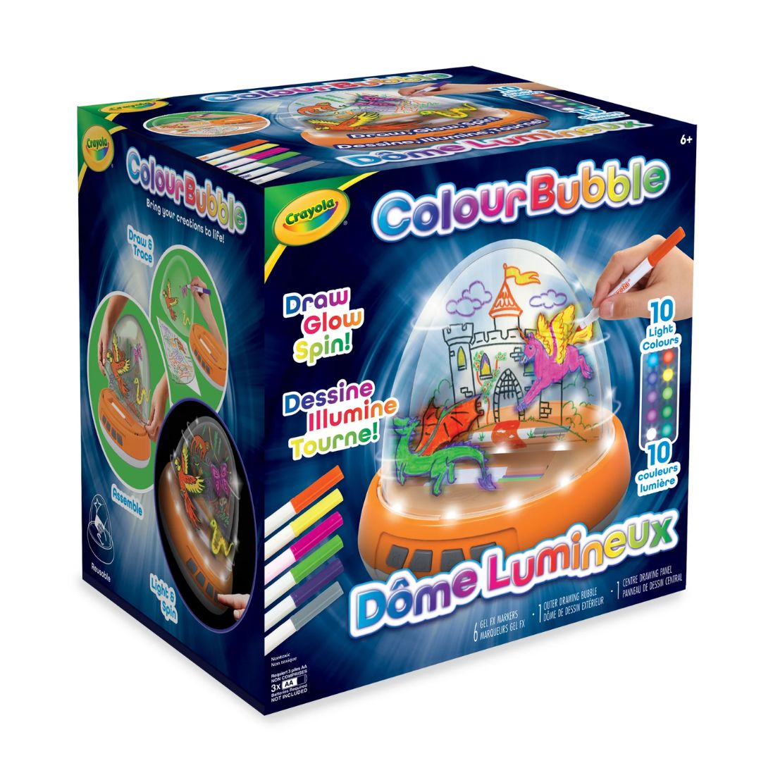 Create amazing dual-layered scenes that glow and spin with the Crayola Colour Bubble. Draw the main image on the center panel and the rest of your scene on the outer dome surface. Then hit the lights, choose your spin speed and brightness, and watch your scene come to life in stunning glow- motion! When you’re ready to create something new, the gel FX markers easily wipe off so you can create scene after scene! Everything you need to create glowing animations is included – an outer drawing bubble, center drawing panel and 6 gel FX markers. This one-of-a-kind colouring toy for kids makes a wonderful holiday or birthday gift for girls & boys, ages 6 & up.