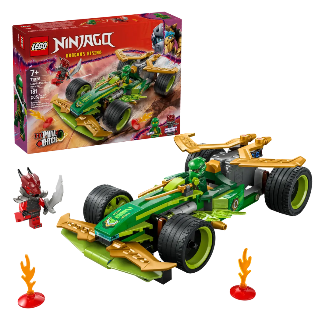 Delight your little ninja with the first-ever NINJAGO® pull-back race car toy! Boys and girls aged 7 and up can recreate superfast action from season 3 of the NINJAGO Dragons Rising TV show with Lloyd’s Pull-Back Race Car (71828) by pulling it back, releasing it and watching it speed forward. The sleek race car has 4 tires, a cockpit for a minifigure and is decorated with green lightning blades.