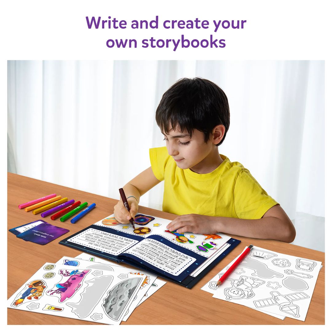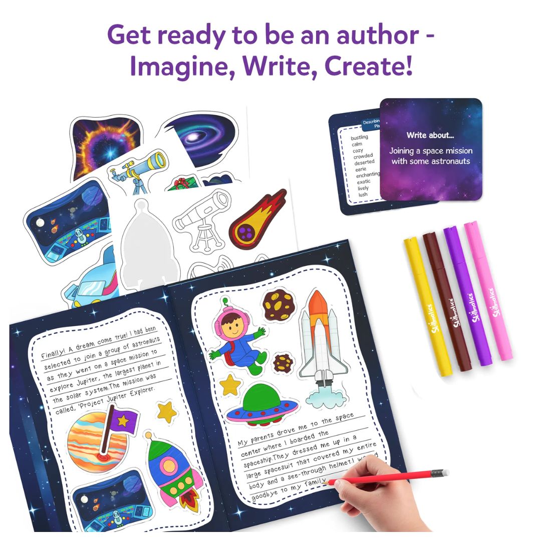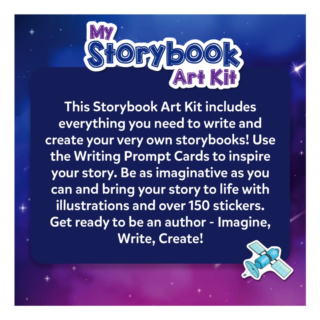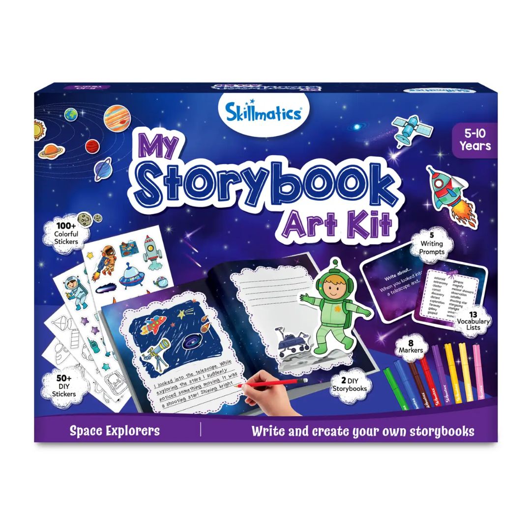Step into the fascinating world of space exploration with Skillmatics'My Storybook Art Kit! Our kit includes everything your child needs to become an author – writing prompts, vocabulary lists, colourful stickers, markers, and hardbound books for their stories!