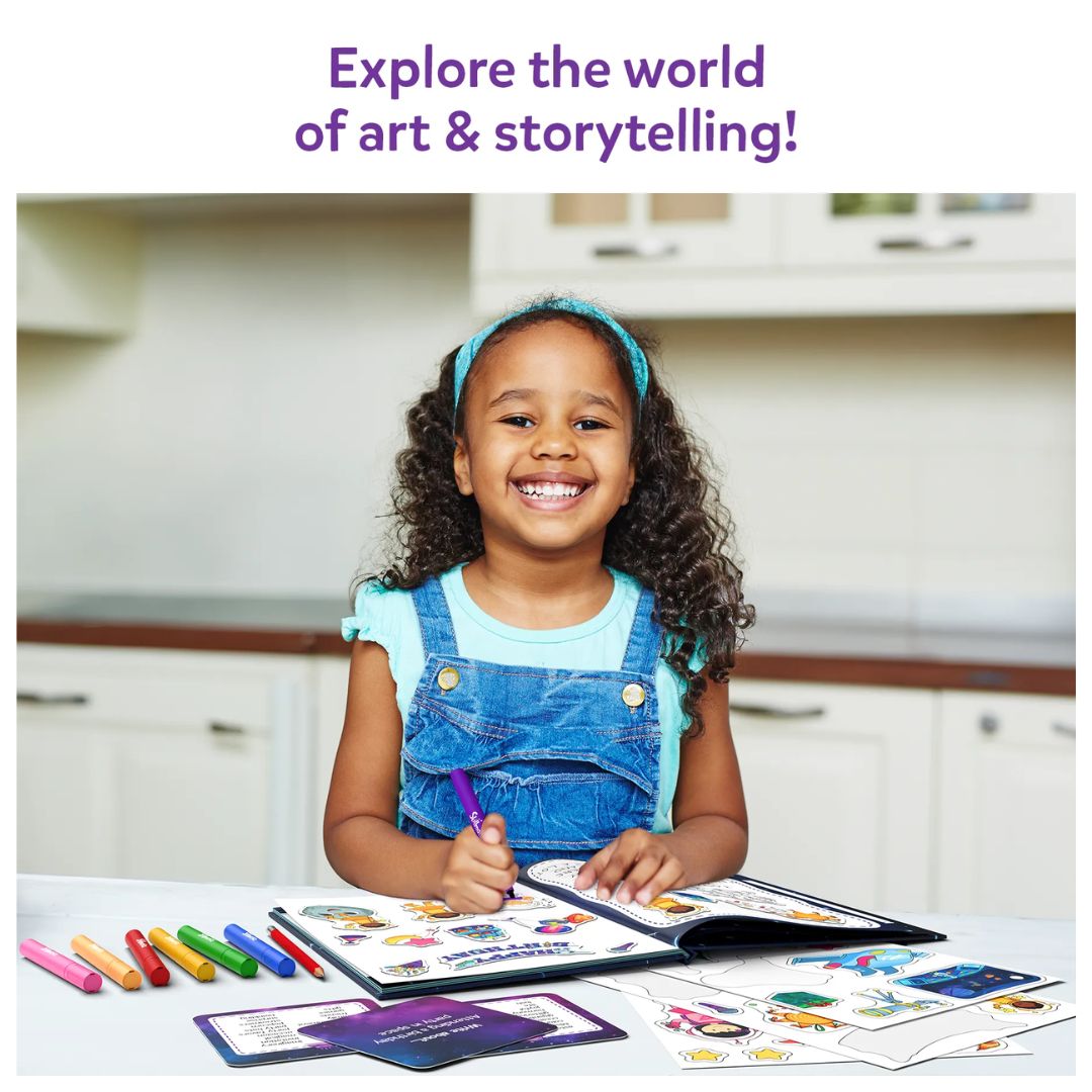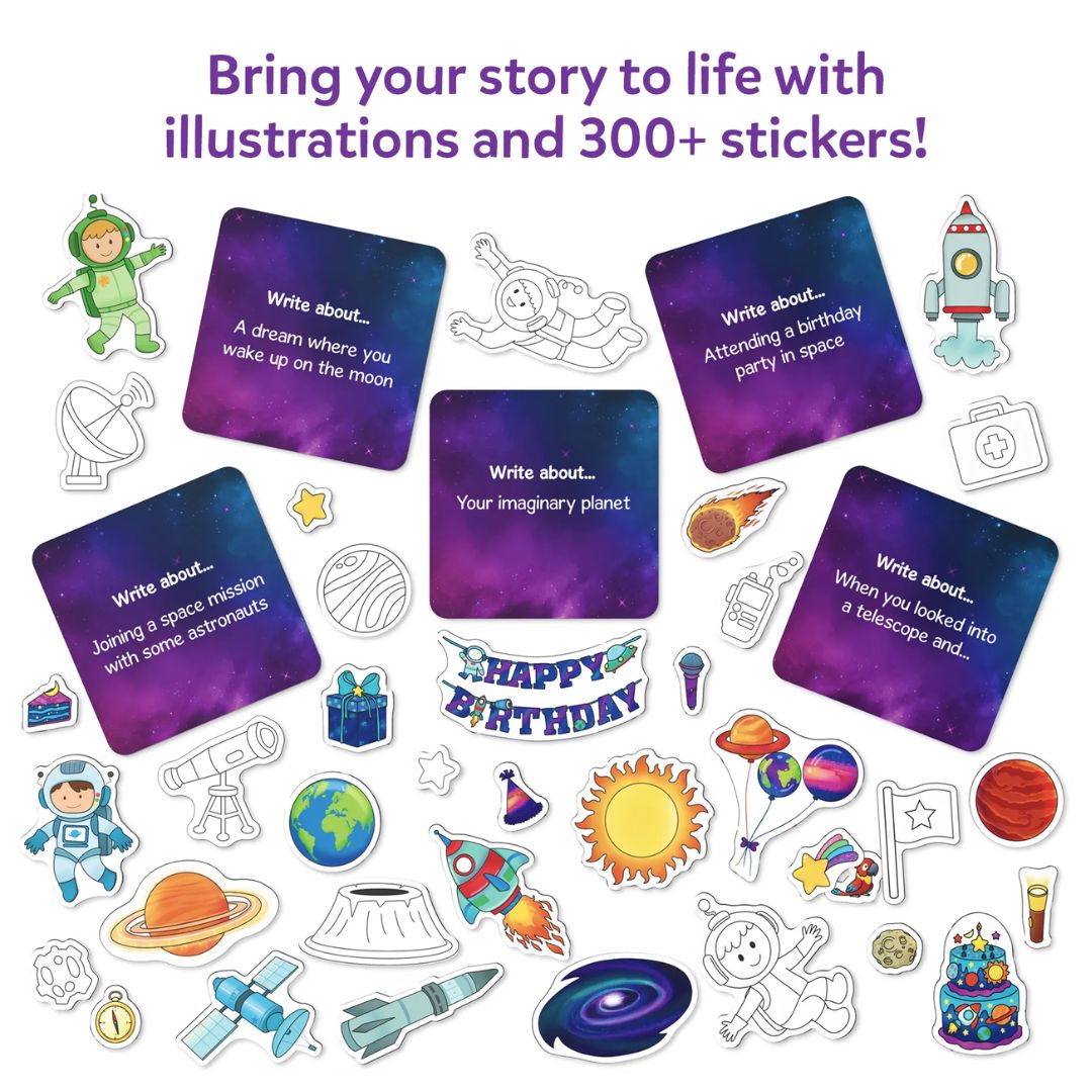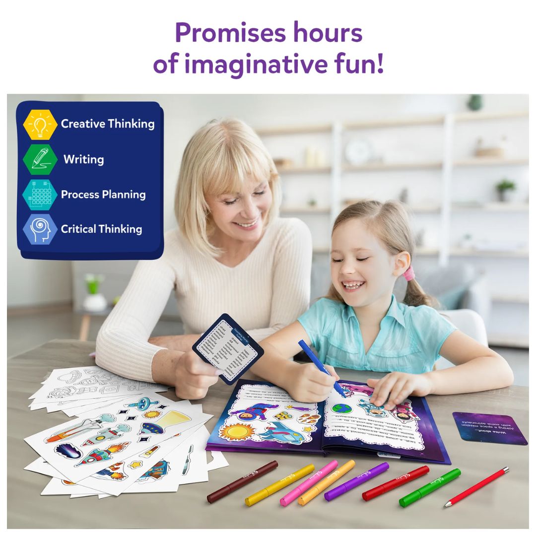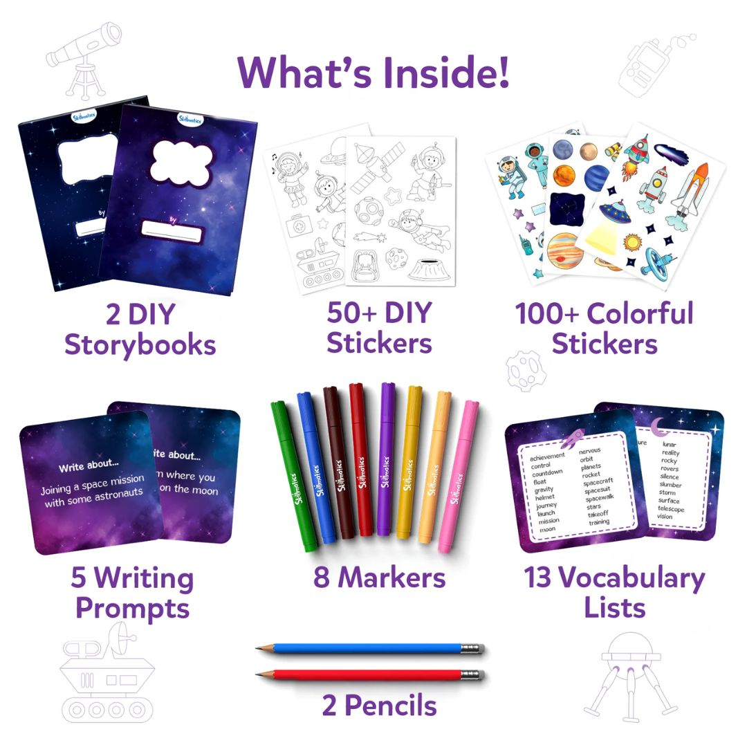 Step into the fascinating world of space exploration with Skillmatics'My Storybook Art Kit! Our kit includes everything your child needs to become an author – writing prompts, vocabulary lists, colourful stickers, markers, and hardbound books for their stories!