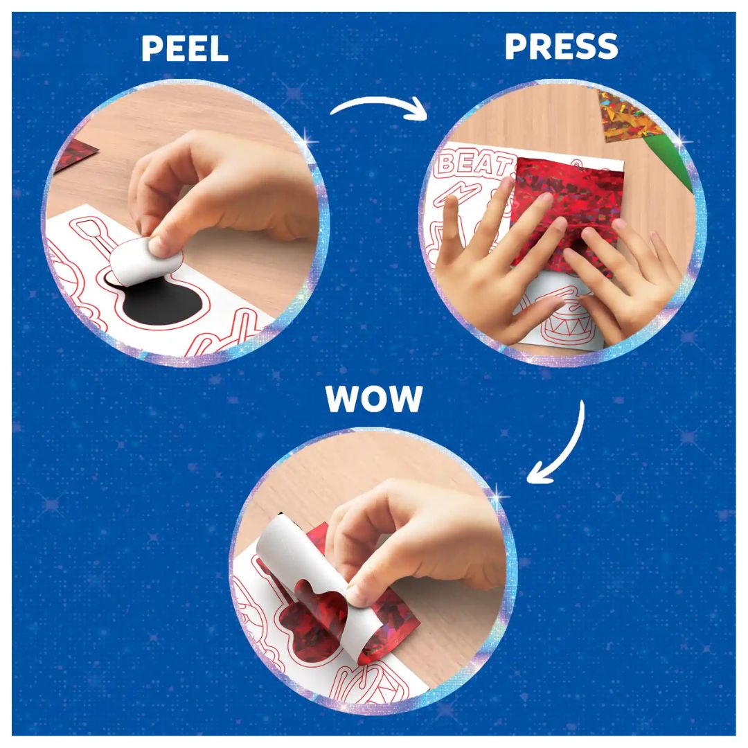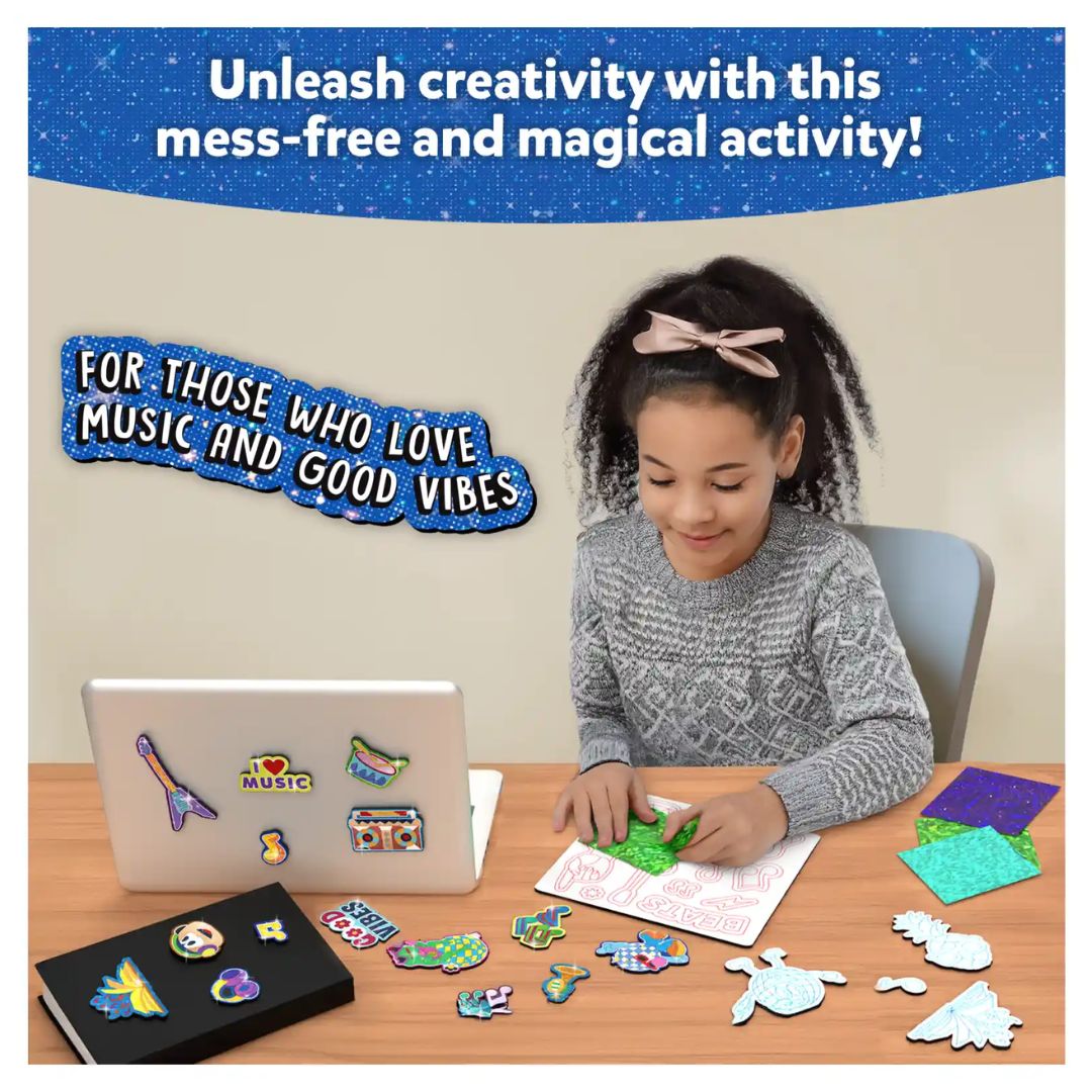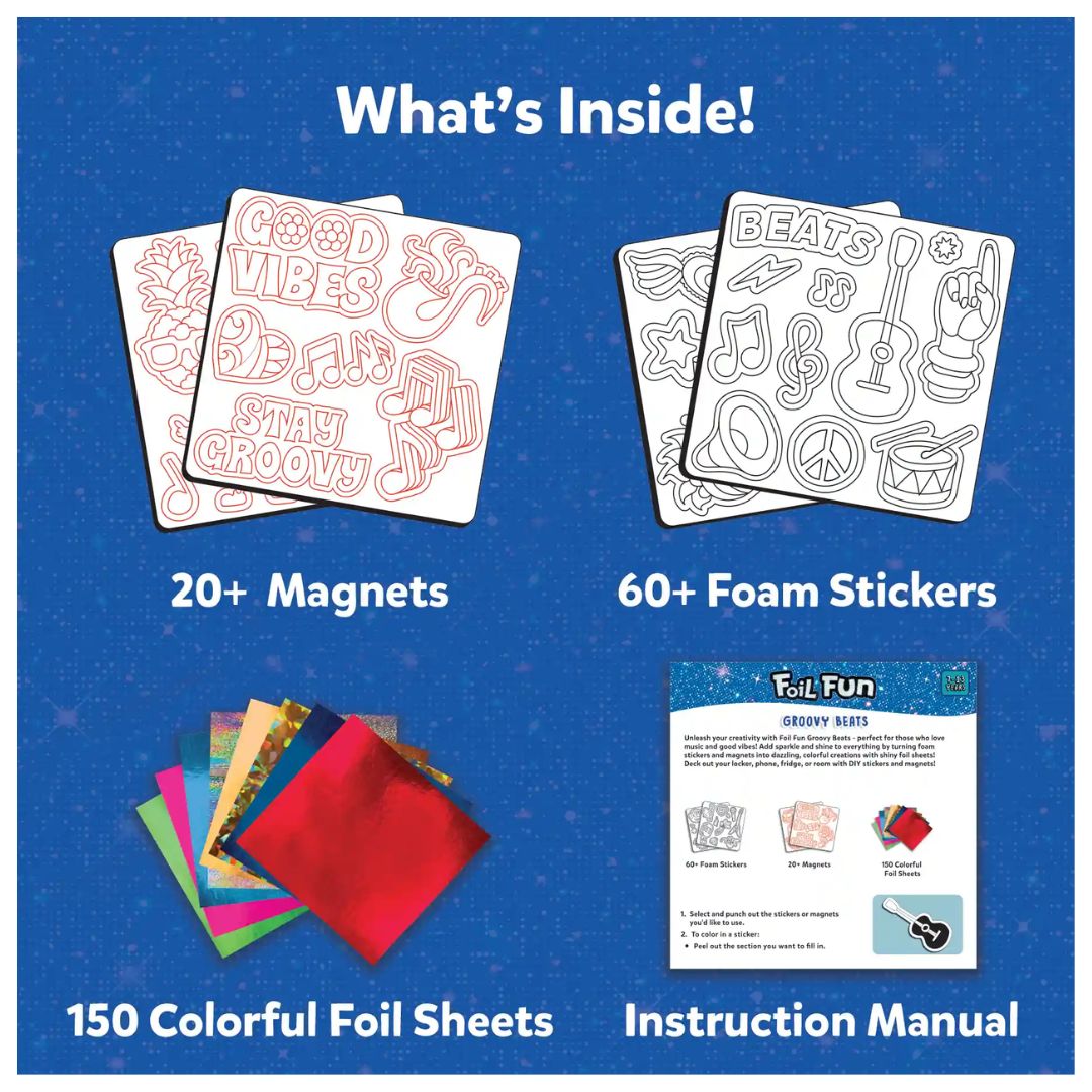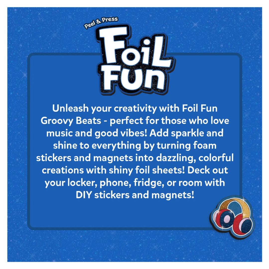 Using the Foil Fun Groovy Beats Art Kit is simple, fun, and completely hassle-free. Start by peeling the sticker or magnet design of your choice, then place a shiny foil sheet over the surface. Press gently, peel back the foil, and watch the magic happen as your design sparkles to life.