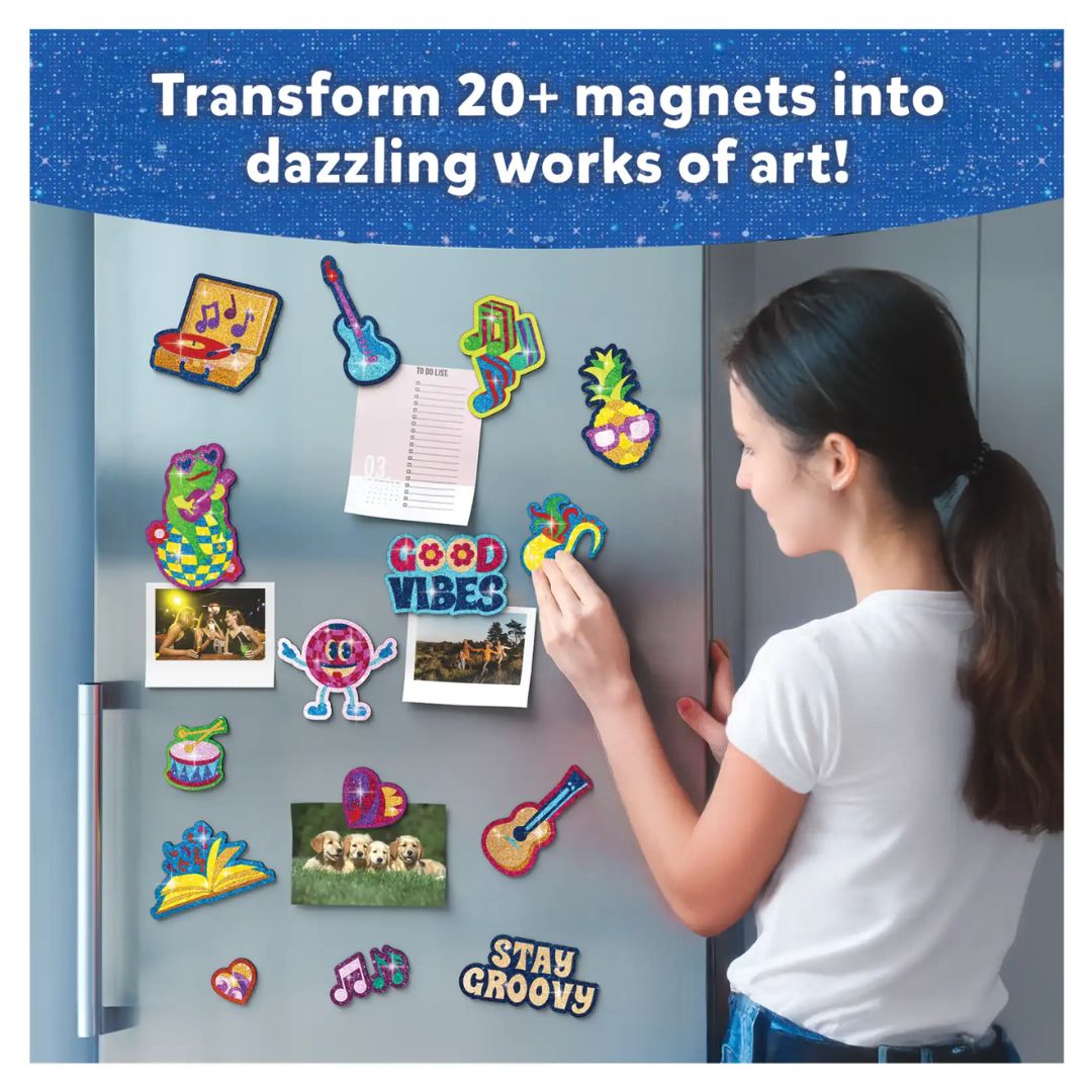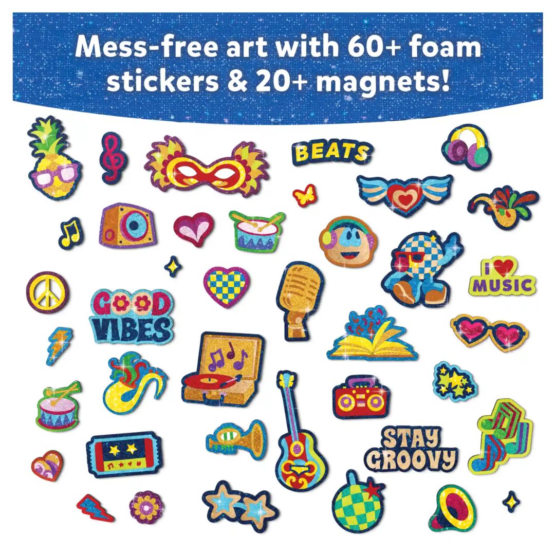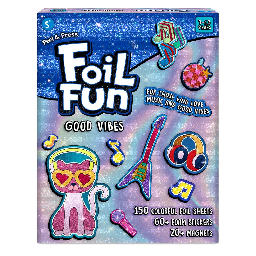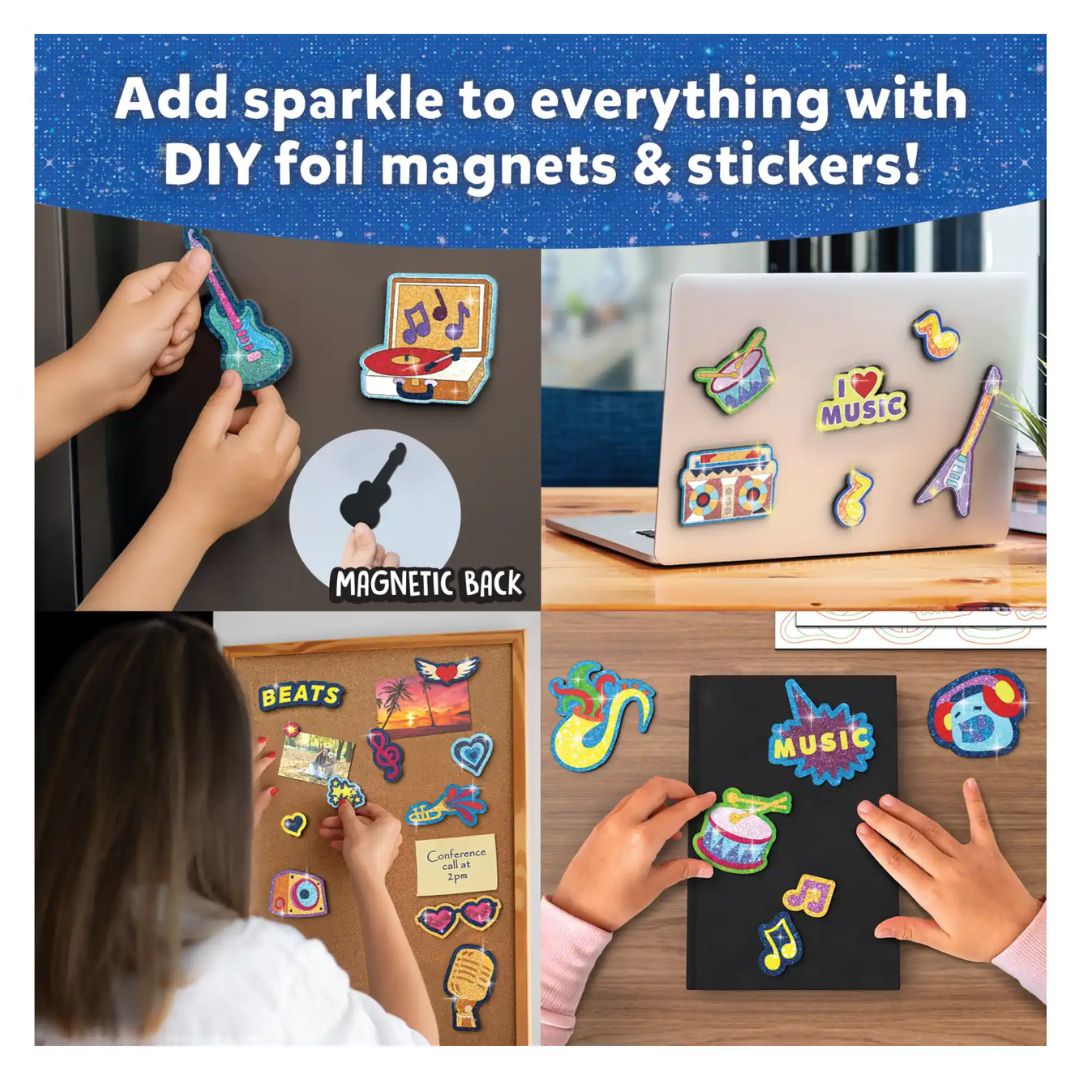 Using the Foil Fun Groovy Beats Art Kit is simple, fun, and completely hassle-free. Start by peeling the sticker or magnet design of your choice, then place a shiny foil sheet over the surface. Press gently, peel back the foil, and watch the magic happen as your design sparkles to life.