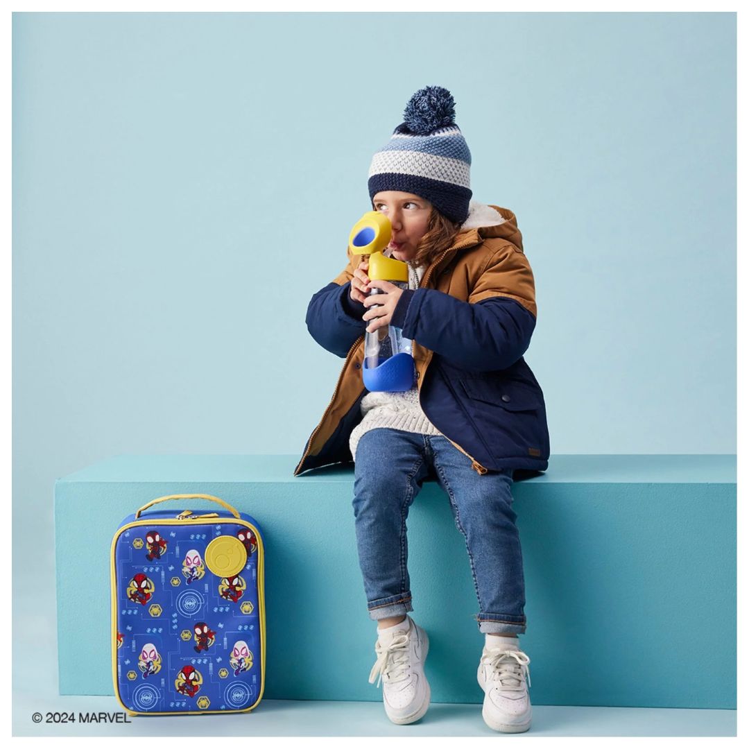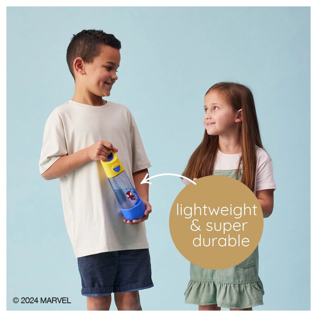 Avengers assemble! Earth’s mightiest heroes have landed at b.box in a new collection. Team up. Save the world. Repeat! Made from Tritan, our unique big kids’ drink bottle is ideal for kindy and school kids. Its unique triangle shape bottle is designed specifically for little hands, making it easier for kids to grip. Easy push button pops open the lid, keeping straw tops hygienic when closed and never goes astray. Spill-proof bite valve straw top prevents accidental spills. Robust carry handle makes it easy for kids to carry and remove out of school bags. Its 450ml capacity and angled silicone straw lets kids drink to the very last drop and stay hydrated throughout the day.