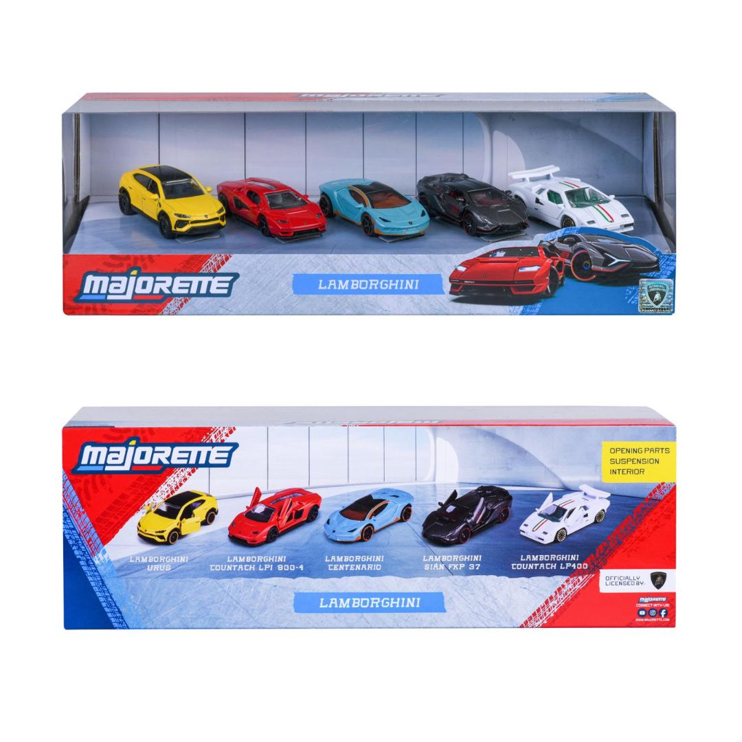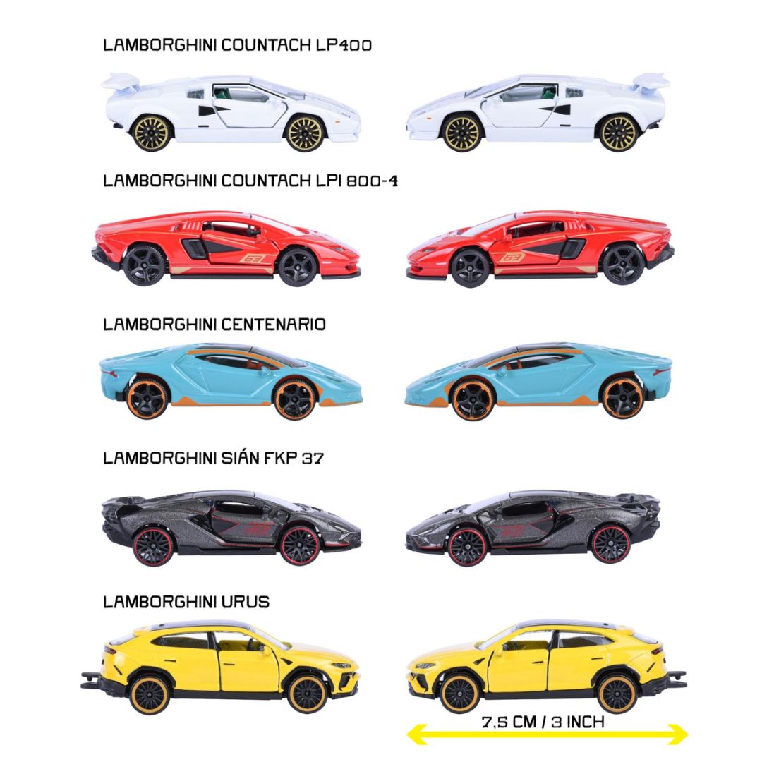 1 playset with 5 metal cars - 1st Lamborghini Sián FKP 37, 2nd Lamborghini Urus, 3rd Lamborghini Centenario, 4th Lamborghini Countach LP400 AND 5th Lamborghini Countach LPI 800-4.