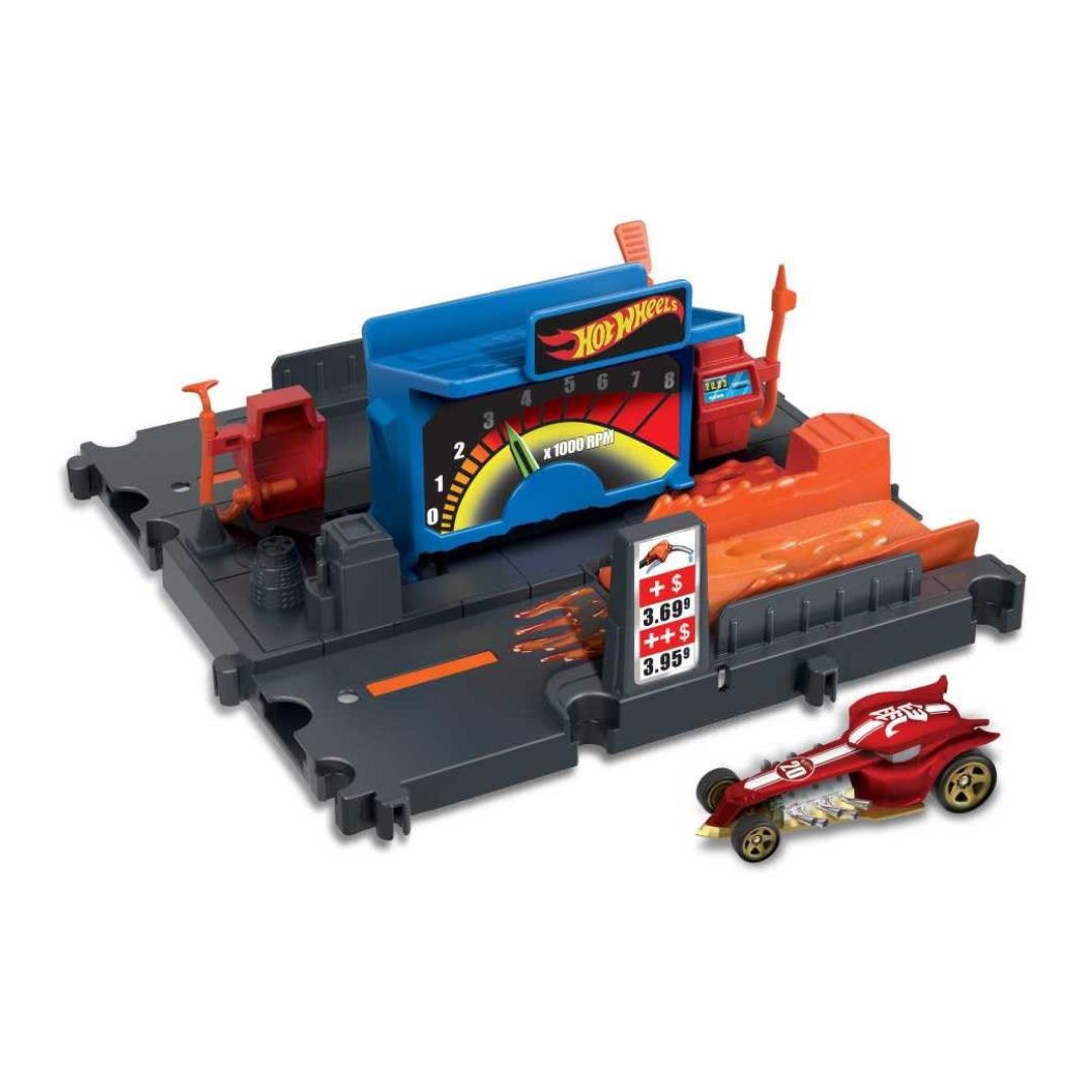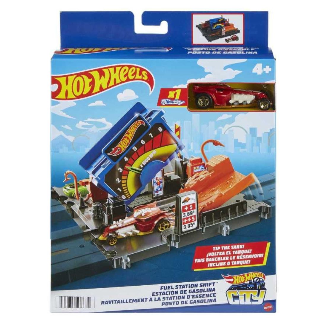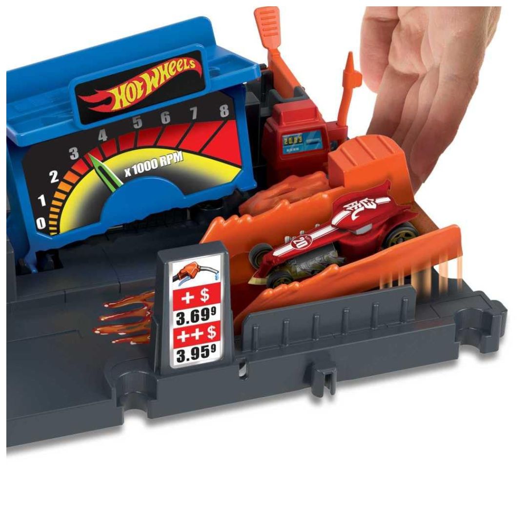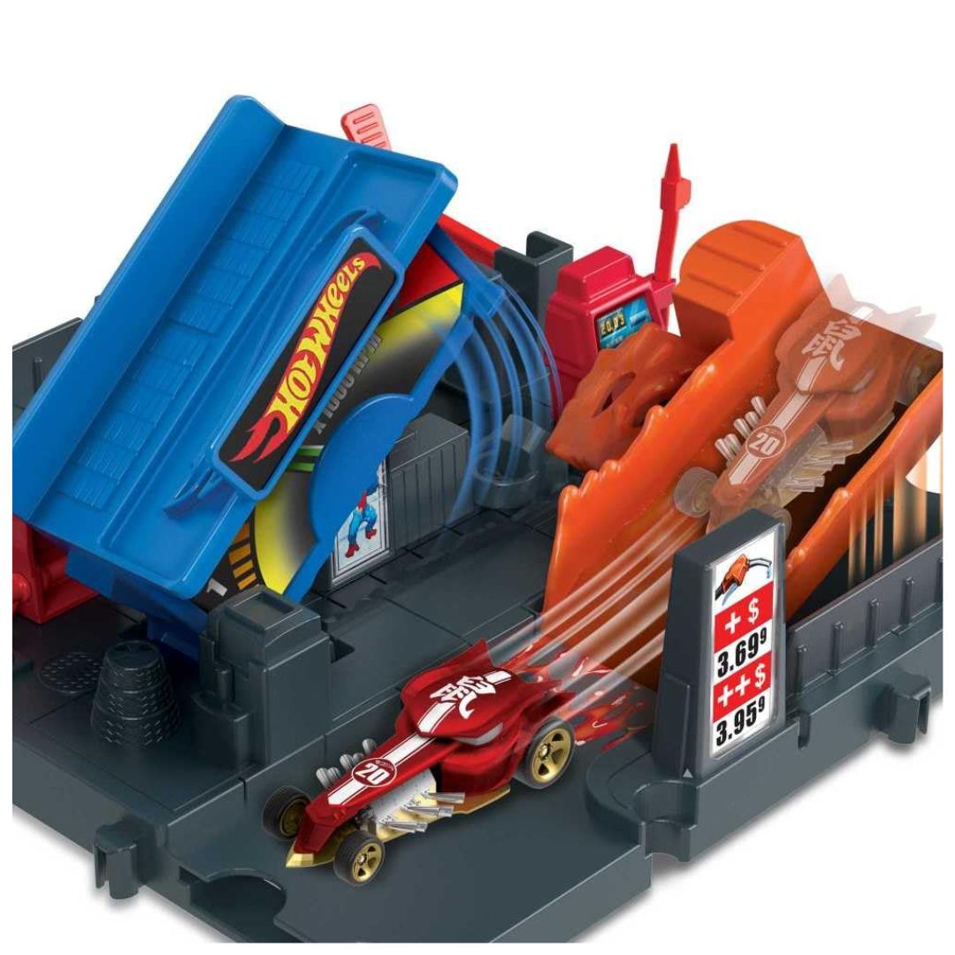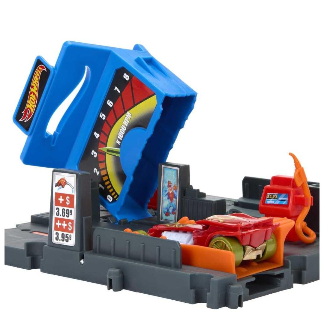 Fill up on gas and dramatic reveals at the Hot Wheels City Gas and Go playset. Cool track-play details such as adjustable gates and bendable hoses enhance the play experience, and when kids lift the ramp to launch their cars, it exposes a nemesis creature who's invaded the minimart. One Hot Wheels vehicle is included, and the set connects to other sets. Makes a great gift for kids 4 years old and up. Colors and decorations may vary.