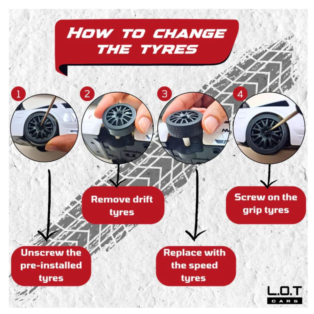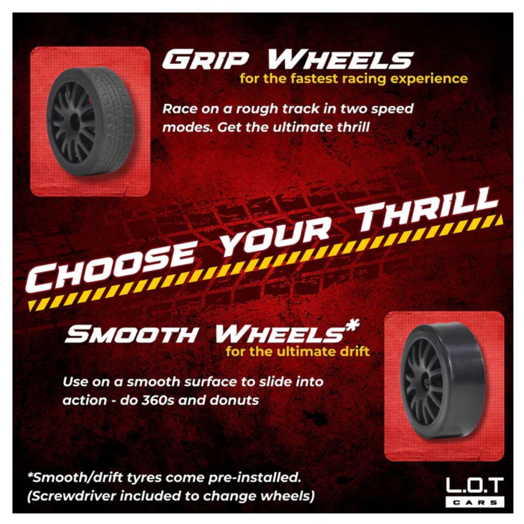 Pro tip: Use drift tyres on smooth surfaces for long, controlled slides. Switch to grip tyres for faster lap times and tighter corner exits.