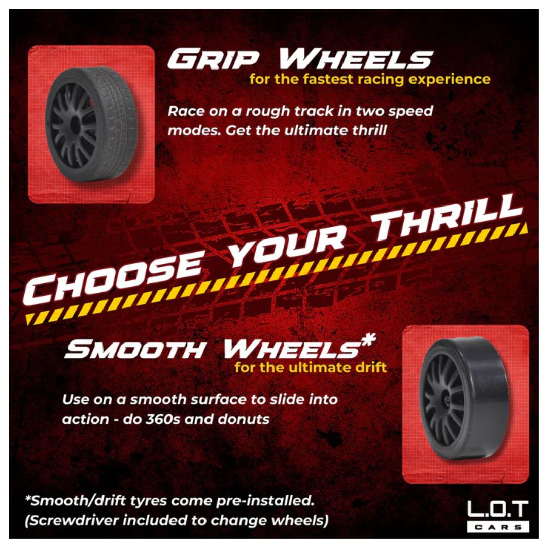 Tyres | Smooth drift set (pre-installed) + Grip set (in box) |