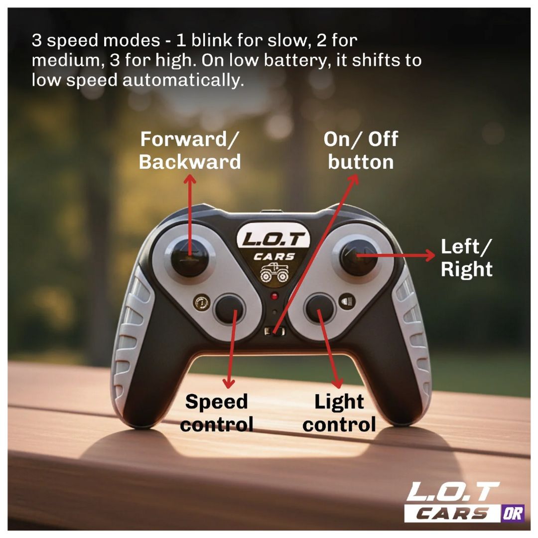Equipped with 3-speed modes (low, medium, high), Knox lets you choose between controlled crawls and full-blown chaos. His 25 kmph top speed turns open ground into a playground, while his large deep-tread tyres grip through grass, gravel, dirt, and anything you dare to send him over.