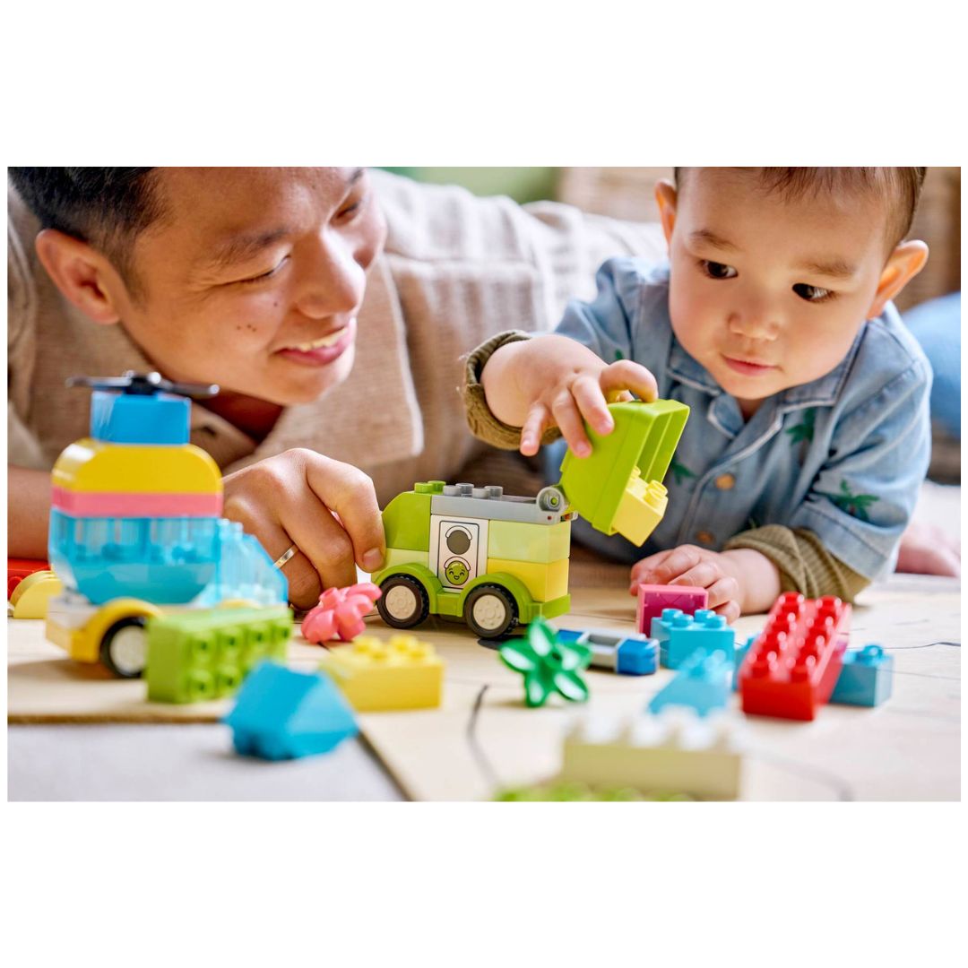 • EVERYDAY VEHICLES – Toddler building kit’s main models include a small car toy, a LEGO® DUPLO® helicopter with a spinning rotor, a dump truck with a tipping bed and a fire truck toy with a ladder and more
