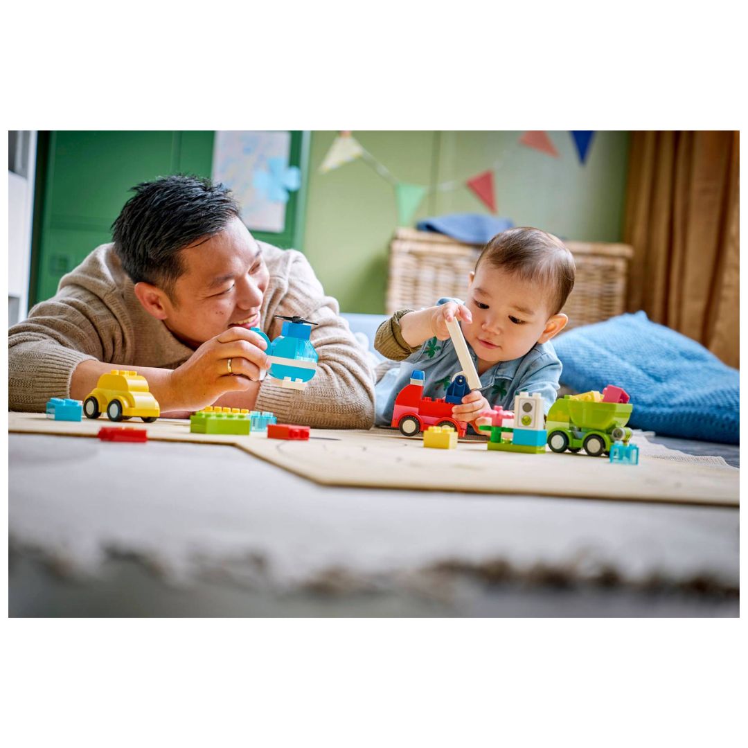 Put open-ended creativity in the hands of toddlers with the LEGO® DUPLO® My First Creative Vehicles (10474) toy. This learning toy for girls and boys ages 18 months plus comes with lots of bricks, pieces and moving functions that will set toddlers’ creative wheels whirring! First, toddlers build the main models of a LEGO DUPLO helicopter with a spinning rotor, a dump truck with a tipping bed, a fire truck toy with a hinged ladder and a small family car toy. Then they use fine motor skills and hand eye coordination to pull apart the bricks from these toy vehicles and add creativity and extra bricks to make all-new creations. From police cars to a super long truck or double-decker bus, toddlers can let their creativity go into overdrive, combining the LEGO DUPLO bricks in new and surprising ways. LEGO DUPLO development toys come with easy-to-handle bricks and engaging features to help toddlers take the first confident steps in their LEGO building journey. Contains 42 pieces.
