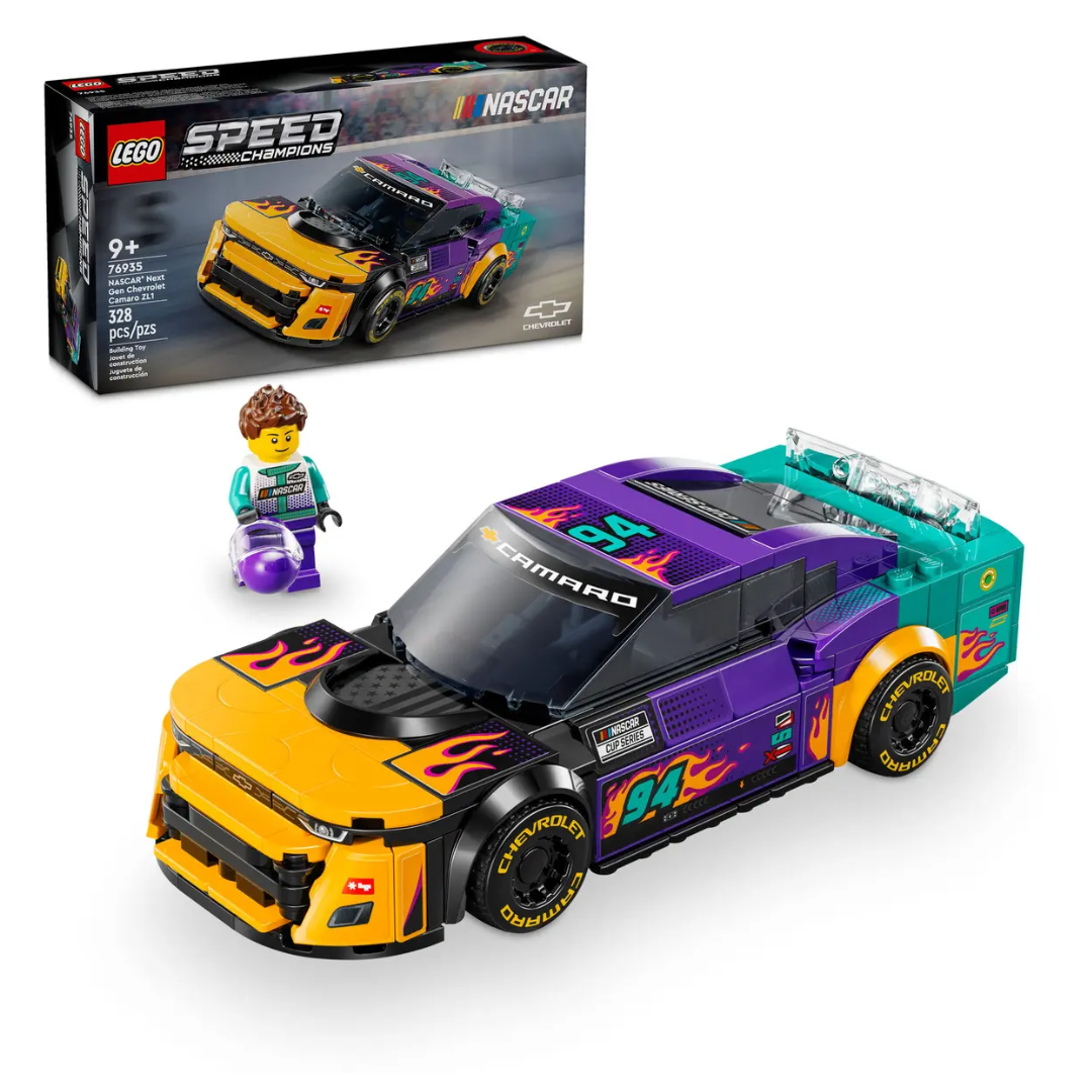 Boys and girls aged 9+ and NASCAR® fans can collect, build, play with and display this LEGO® Speed Champions NASCAR Next Gen Chevrolet Camaro ZL1 (76935) toy car for kids. This powerful race car decorated in vibrant colors and flames includes design details from real-life cars that race in the NASCAR Cup Series.