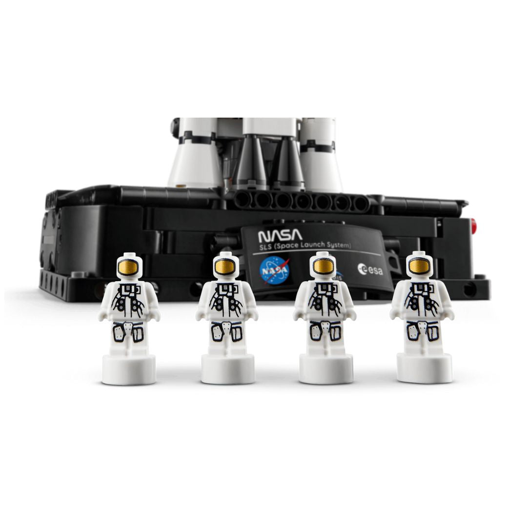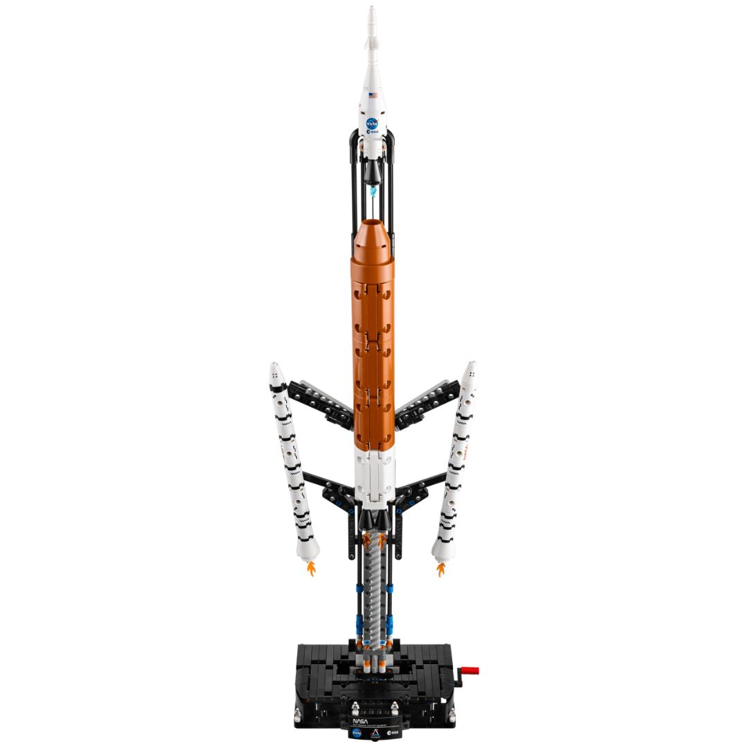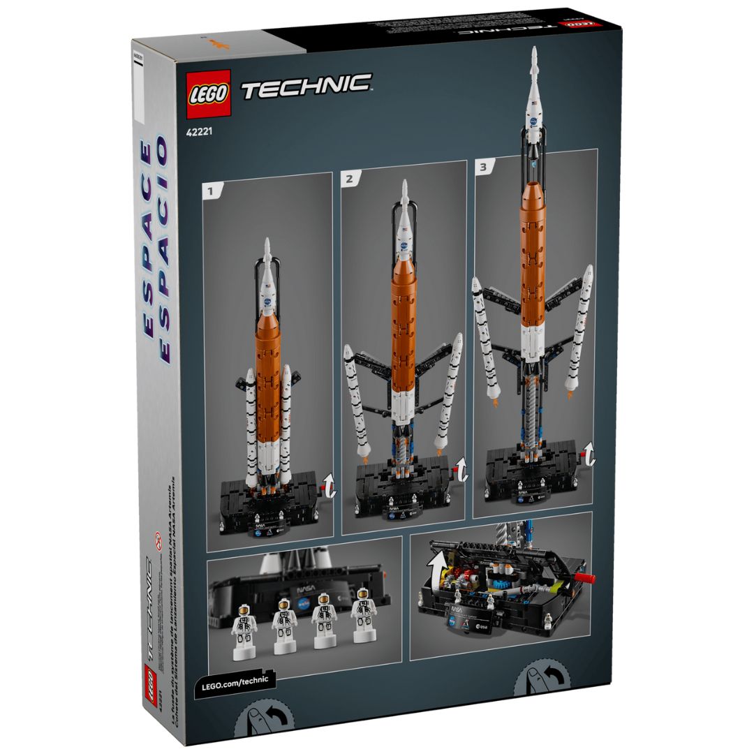 Launch a journey of discovery with this NASA Artemis Space Launch System Rocket model kit (42221) for boys, girls and kids ages 9 plus. The educational LEGO® Technic™ set shows the moment a rocket launches, in 3 distinct stages. Turn the crank to see the solid rocket boosters separate from the core stage, which then also detaches. Continue turning to watch the upper stage with its engine module, Orion spacecraft and launch abort system separate. This rocket building kit has been developed in collaboration with NASA and ESA, and lets kids explore the space launch system that will launch the Orion spacecraft into lunar orbit. It includes 4 astronaut nanofigures, fun blue flame details, plus an information panel to create an eye-catching display. This LEGO Technic building set makes a fun gift for space enthusiasts. Kids can build with confidence using the LEGO Builder app, which lets them zoom, rotate in 3D and track progress with easy-to-follow digital instructions. Set contains 632 pieces.